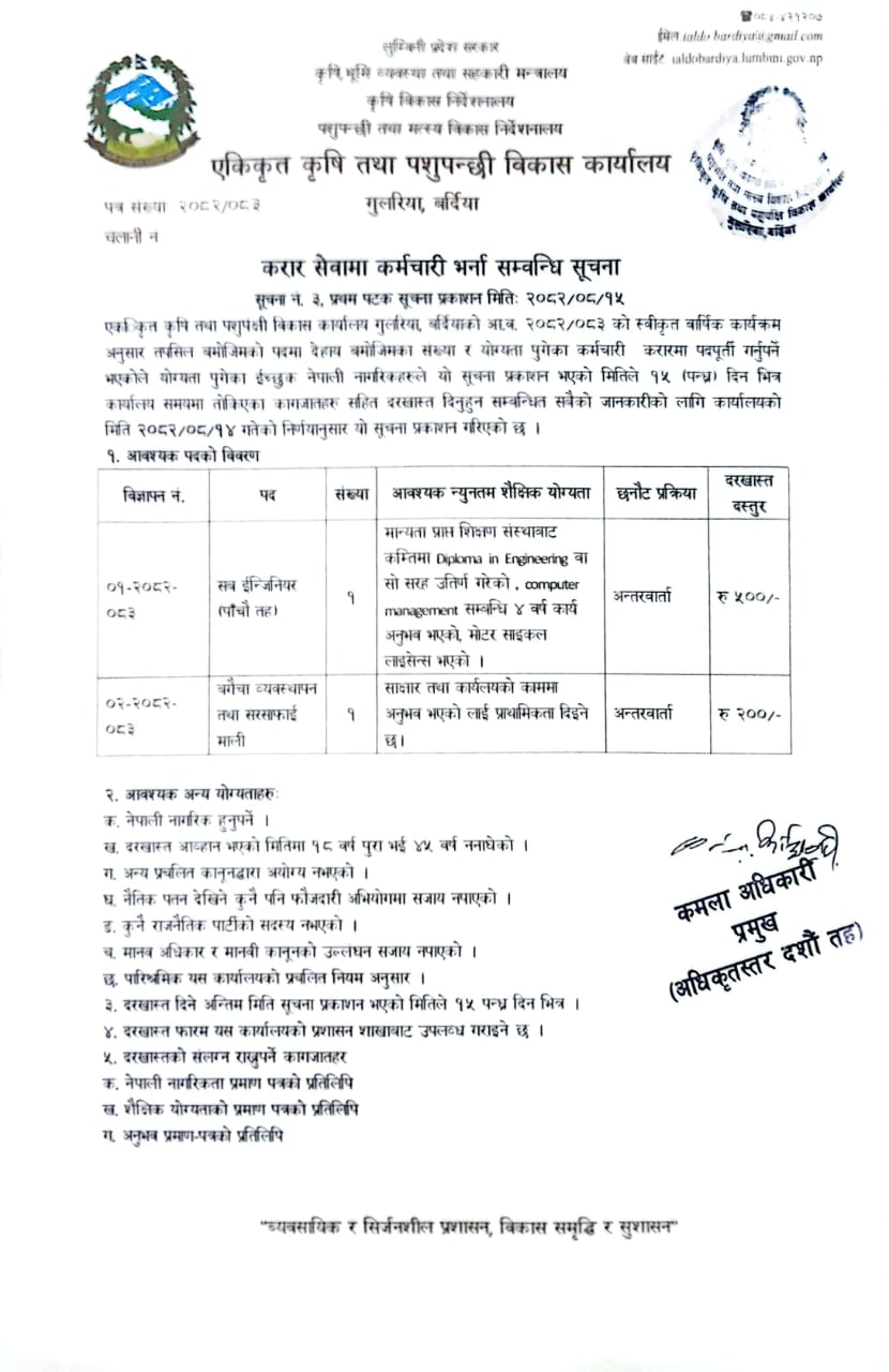 भूमि व्यवस्था, कृषि तथा सहकारी मन्त्रालयका मन्त्री माननीय आरती पौडेल ज्यूबाट २०७७ साउन २१ गते एकिकृत कृषि तथा पशुपन्छी विकास कार्यालय, बर्दियाको विधिवत उद्घाटन भई कार्य प्रारम्भ भएको हो । साबिक जिल्ला कृषि विकास कार्यालयको भवनमा यस कार्यालय रहेको छ । लुम्बिनी प्रदेशको भुमि व्यवस्था, कृषि तथा सहकारी मन्त्रालय मातहतको यस कार्यालयले कृषि आधुनिकिकरण, यान्त्रीकरण र व्यवसायिकरणका लागी विभिन्न कार्यहरु... थप हेर्नुहोस
